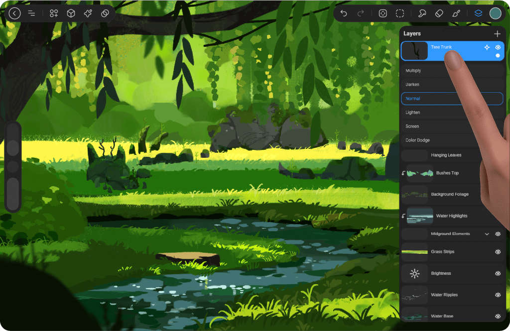 To navigate through the available Blend Modes, simply scroll up and down within the list inside the blue rectangle. The active Blend Mode will be highlighted within this frame, and its effect will be displayed live on your artwork.