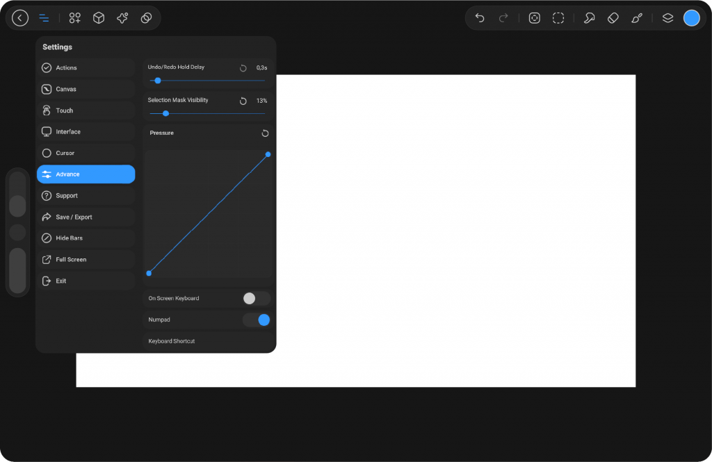 Pressure Curve – Customize pen pressure response for natural stroke dynamics.