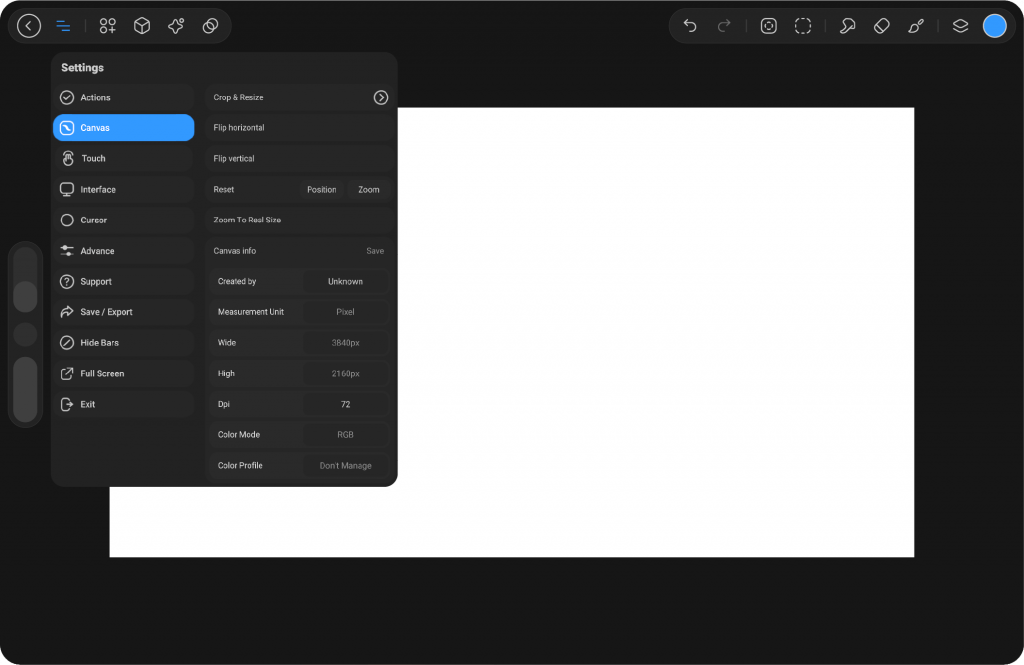 The Canvas section allows you to manage the core workspace where your artwork lives. It provides tools to reshape, flip, and reset the canvas while also giving you insight into its technical details.
