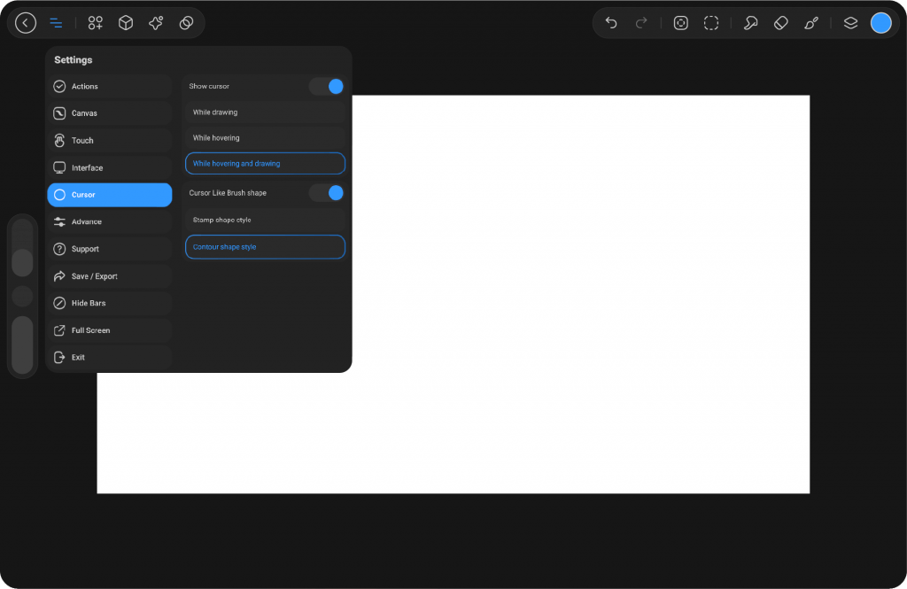 The Cursor section refines how your cursor behaves while drawing. This helps improve accuracy and gives a clearer understanding of how strokes will appear.