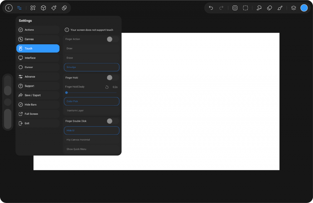 Finger Hold – Define actions when holding a finger on the screen (e.g., Color Pick, Transform Layer).